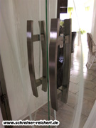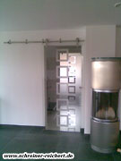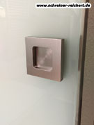 Glasschiebetüren mit sandgestrahlten Quadraten an Design Edelstahl Beschlägen.