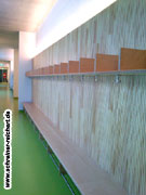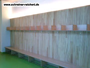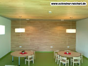 Rückseitige Wandverkleidung aus schallschluckenden Akustikplatten in Weisstanne.
