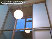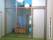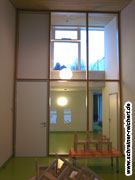 Raumhohe Trennwand in Pfosten/Riegel Konstruktion mit großen Glaselementen zur Abtrennung der Gruppenräume.