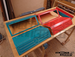 Verarbeitet wurden TransColor Holzwerkstoffplatten. Das ist farbig gebeiztes Birkensperrholz, welches mit Klarlack versiegelt ist, wobei die Holzmaserung noch durchscheint.