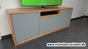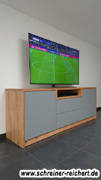 TV-Sideboard in Eiche astig, mit grauen Fronten.