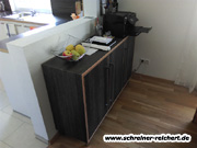 Platte, Türen des Oberschranks und Schubkastenfronten belegt mit markantem Parkettboden.